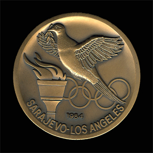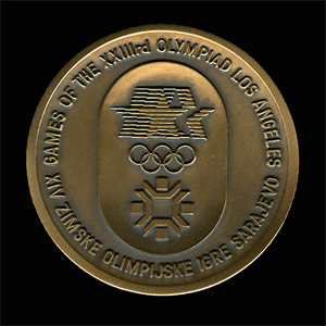 The 1984 Olympic Games Medallion issued jointly by the Organizing Committees of the Games of XXIIIrd Olympiad in Los Angeles, California and the XIV Olympic Winter Games in Sarajevo, Yugoslavia.