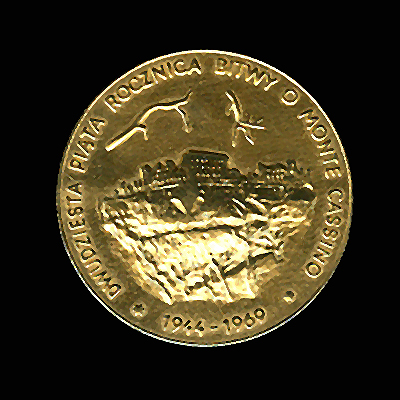 Obverse: In the center, Monte Cassino with Abbey. In the air above, the tree limbs after the bombing. Inscription, around: • DWUDZIESTA PIATA ROCCZNICA BITWY O MONTE CASSINO • 1944-1969