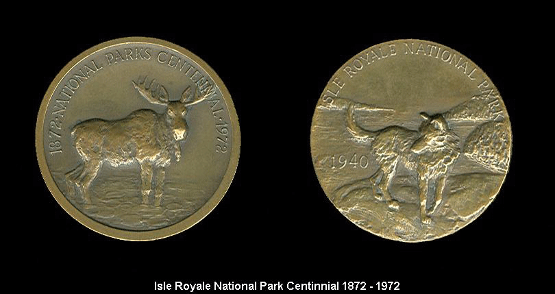 The National Park medal with the MOOSE on the obverse and the WOLF on the reverse, commerates the first National Park - Yellowstone 1872-1972. The 1940 refers to the date the Isle Royale National Park was established . The park is made up of 200 islands in Lake Superior.