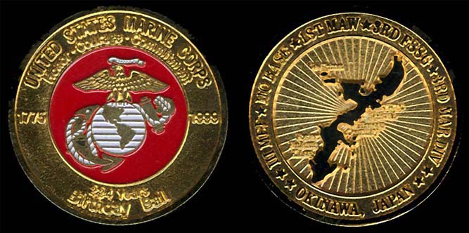 Obverse: The Marine Corps Eagle Globe & Anchor (silver colored) and surrounded by scarlet in center, UNITED STATES MARINE CORPS, / Honor . Courage . Commitment, around above / 1775, left 1999 right / 224 Years / Birthday Ball, around below.