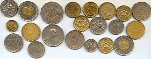 Jeff retrieved the following items at the swap shop from the dealer. Two (2) two dollar Canada coins (Polar bears), two (2) one dollar Canada coins (Loons), 1 Five (5) franc Swiss coin, two (2) five dollar Hong Kong coins, three (3) 1 dollar Singapore coins, two (2) 50 cent Singapore coins, one (1) 20 cent Singapore coin, one (1) 10 cent Singapore coin, one (1) 5 cent Singapore coin, one (1) 50 cent Australia coin, one (1) 100 pesetas of Spain, one (1) 100 won of South Korea, one (1) 500 won of South Korea and two (2) Ontario Place tokens. Cost was $ 3.50 for the lot.