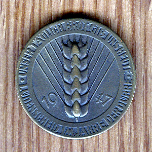 Obverse: in the center, a wheat stalk dividing the date 1947, unser taglich brot gib uns ludenscheid im jahre durre , around incused.
